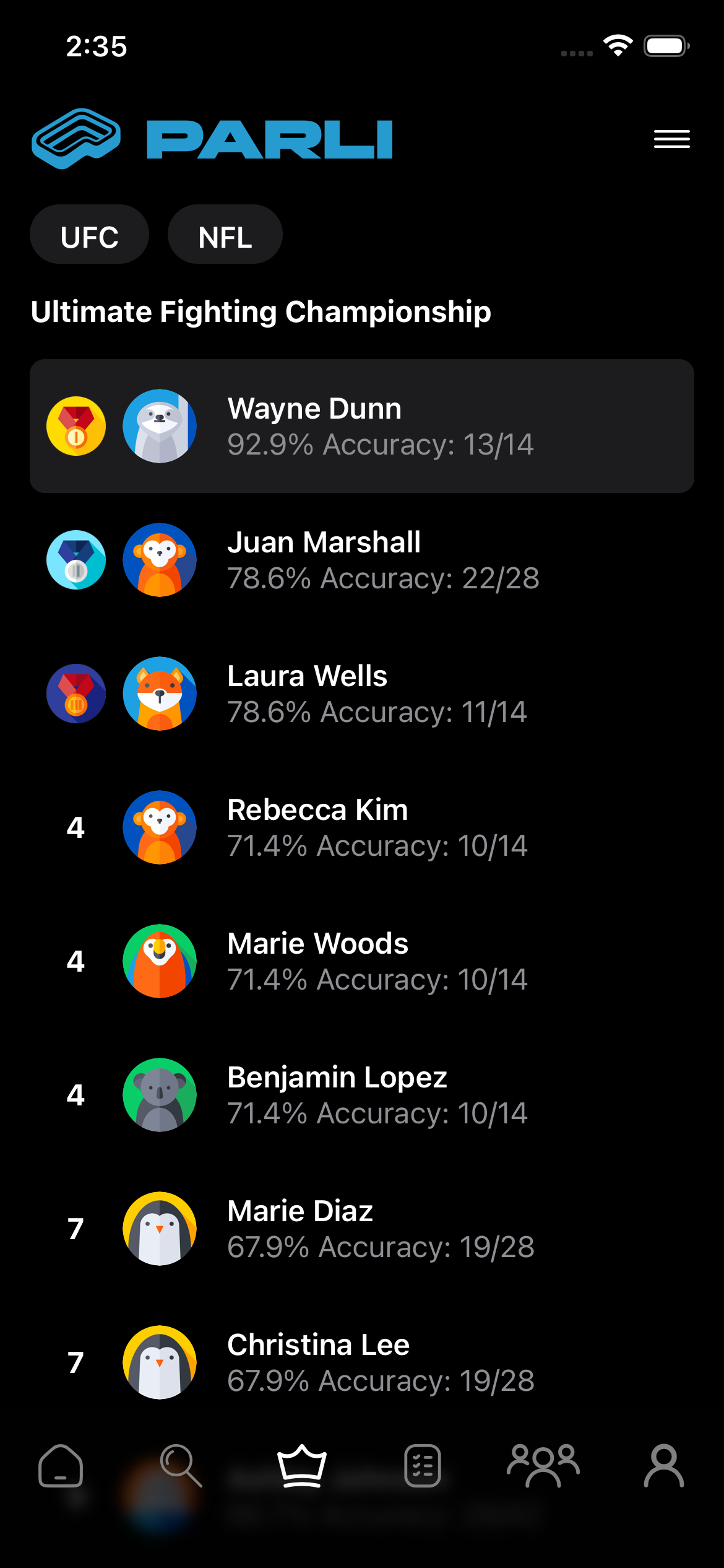Track your stats and rankings across pools to see how you stack up. Show off your accuracy and badges to flex your sports knowledge to friends and communities.